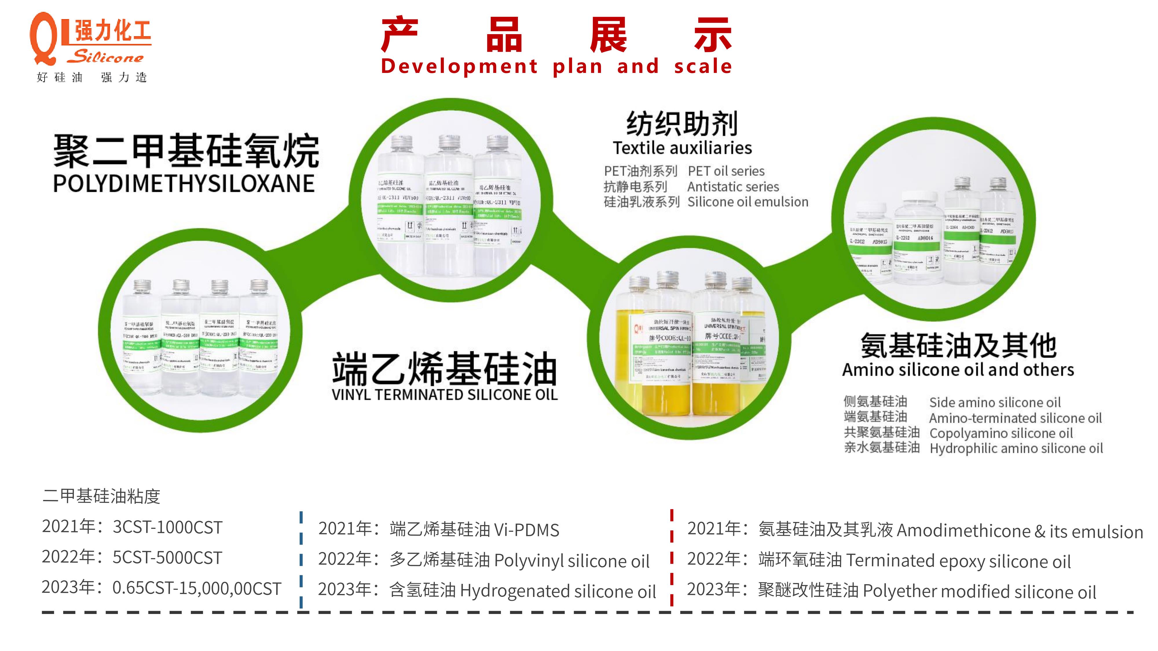 集研发,创新,生产,销售相结合,重点以生产研发有机硅新材料:以二甲基硅油、乙烯基硅油为主,以羟基硅油、有机硅乳液,氨基硅油,纺织助剂为辅的多元化化学工厂。