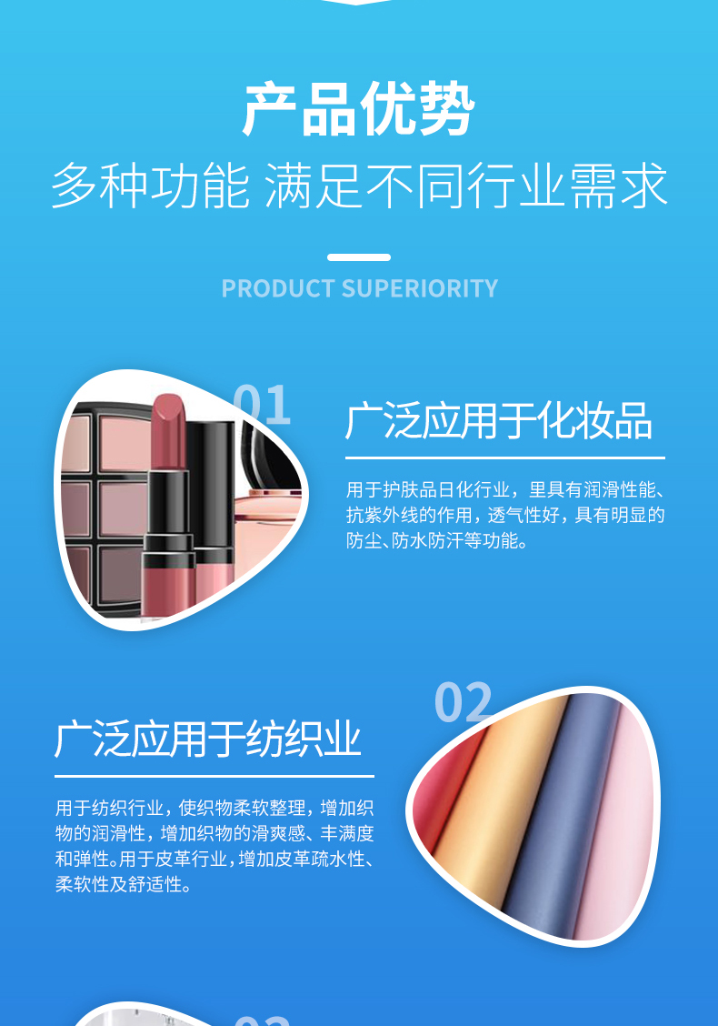 集研发,创新,生产,销售相结合,重点以生产研发有机硅新材料:以二甲基硅油、乙烯基硅油为主,以羟基硅油、有机硅乳液,氨基硅油,纺织助剂为辅的多元化化学工厂。